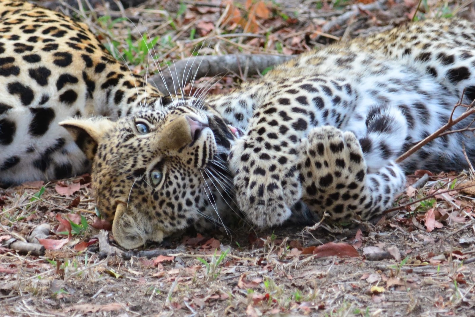 Tamboti female resting on the dry leaves in the shade of many trees...Tamboti cub amuses himself with moms tail.